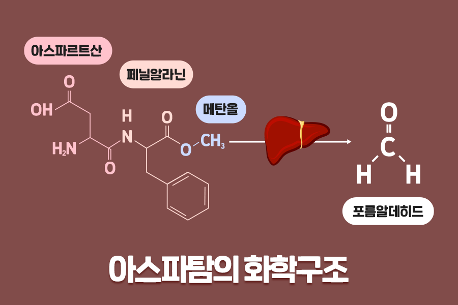 대표적인 인공감미료인 ‘아스파탐’은 ‘아스파르트산’과 ‘페닐알라닌’이라는 아미노산이 결합된 화학구조로 이루어져 있습니다. 아스파탐이 분해되면 그 중 일부가 소장에서 메탄올(CH3-OH)로 분해되고 이 미량의 메탄올이 간에서 대사되는 과정에 독성물질인 포름알데히드(HCOH)로 변환될 가능성이 있습니다. 이로 인해 아스파탐의 위해성에 대하여 많은 의문들이 제기되었습니다.