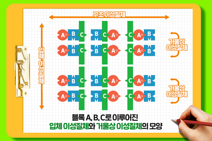 반면 구성 성분은 물론, 결합 순서도 동일해 물리적 성질과 화학적 성질까지 유사한 입체 이성질체(stereo isomer)도 있습니다. 위 그림을 보면 블록 A, B, C를 하나씩 사용하여 결합할 경우 나올 수 있는 12가지의 모양이 나타나 있습니다.