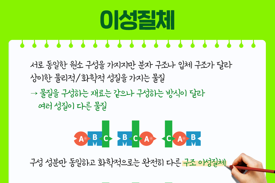 본격적인 이야기를 진행하기 전에 ‘이성질체(異性質體·isomer)’에 대해서 알아보도록 하겠습니다. 촉매의 정의와 마찬가지로 이성질체의 정의 또한 IUPAC(International Union of Pure and Applied Chemistry)에서 합의가 되어있습니다. IUPAC에서는 ‘이성질체’란, ‘서로 동일한 원소 구성(분자식)을 가지지만 분자 구조나 입체 구조가 달라 상이한 물리적·화학적 성질을 가지는 물질’로 정의하고 있습니다. 조금 더 쉽게 말하자면, 물질을 구성하는 재료는 같으나 구성하는 방식이 달라 여러 성질이 다른 물질이라고 볼 수 있습니다.