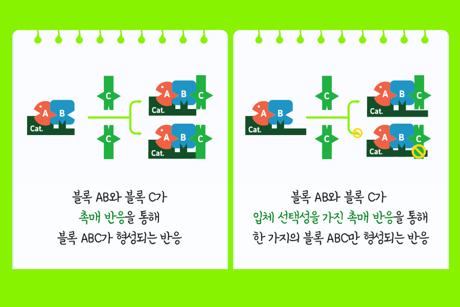 왼쪽 그림과 같이 블록 ABC의 형성을 촉진하는 촉매에 입체 선택성이 없다면, 블록 AB에서 블록 ABC를 만드는 것은 블록 C의 방향과 상관없이 두 가지 모양의 블록 ABC가 형성될 수 있습니다.