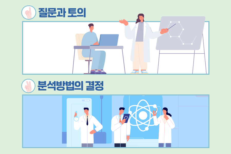 물질의 어떠한 특성을 분석하고자 하는지, 정성 분석이 필요한지, 정량 분석이 필요한지 등의 질문을 던지고, 물질에 대해 최대한 많은 정보를 얻기 위해 질문합니다. 그리고 이에 대한 해답은 분석을 요청한 사람으로부터 상당 부분을 얻을 수도 있습니다.