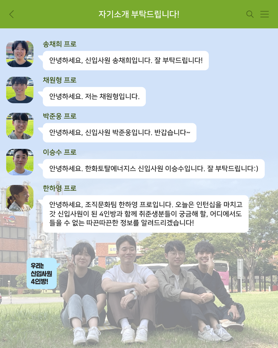 이승수 프로 : 안녕하세요. 한화토탈에너지스 신입사원 이승수입니다. 잘 부탁드립니다.