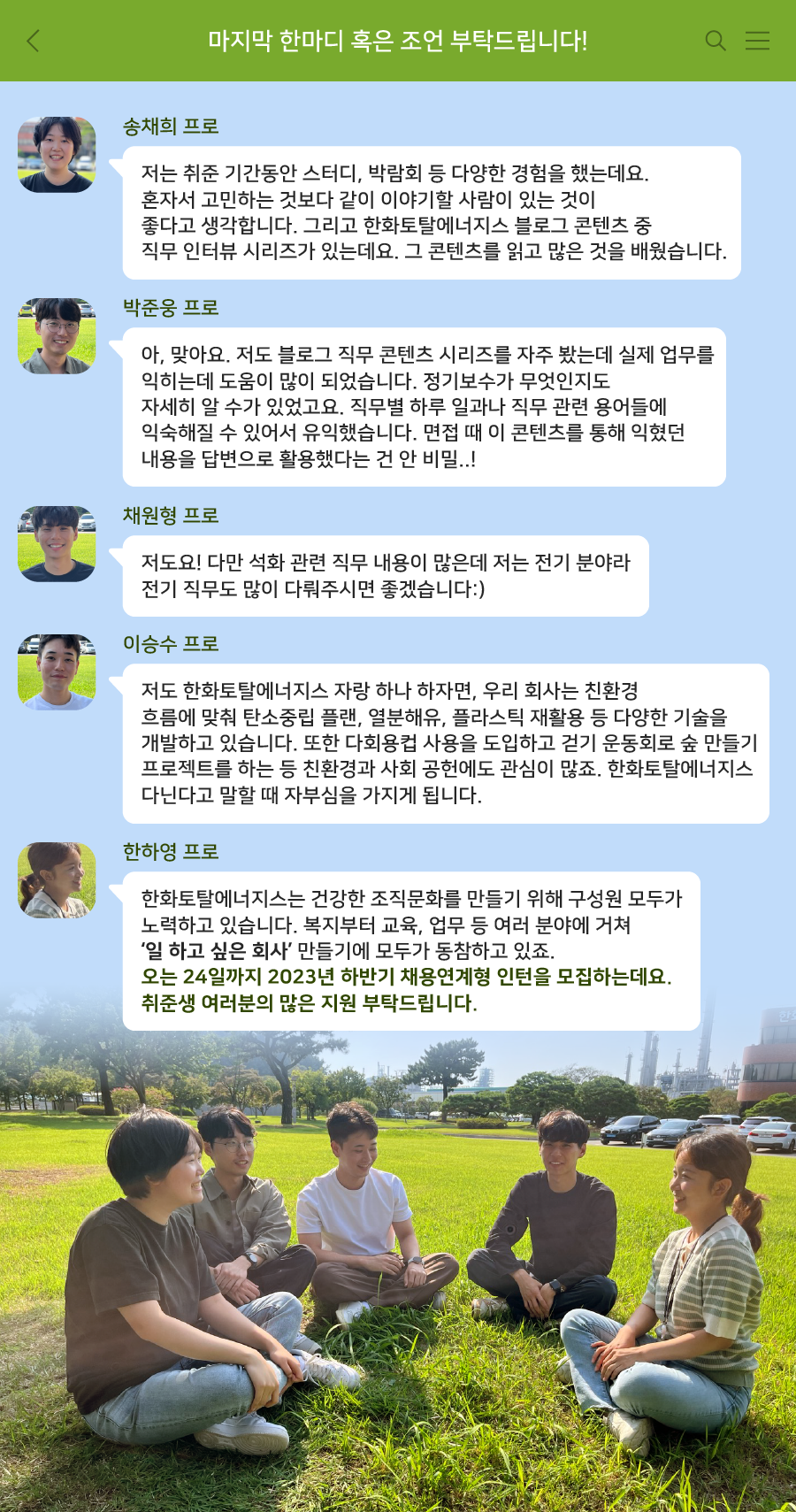 송채희 프로 : 저는 취준 기간동안 스터디, 박람회 등 다양한 경험을 했는데요. 혼자서 고민하는 것보다 같이 이야기할 사람이 있는 것이 좋다고 생각합니다. 그리고 한화토탈에너지스 블로그 콘텐츠 중 직무 인터뷰 시리즈가 있는데요. 그 콘텐츠를 읽고 많은 것을 배웠습니다.
