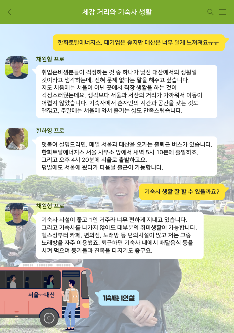한하영 프로 : 덧붙여 설명드리면, 매일 서울에서 대산을 오가는 출퇴근 셔틀버스도 있습니다. 평일에도 서울로 퇴근해서 다음날 다시 대산공장으로 내려가는 분도 많답니다!