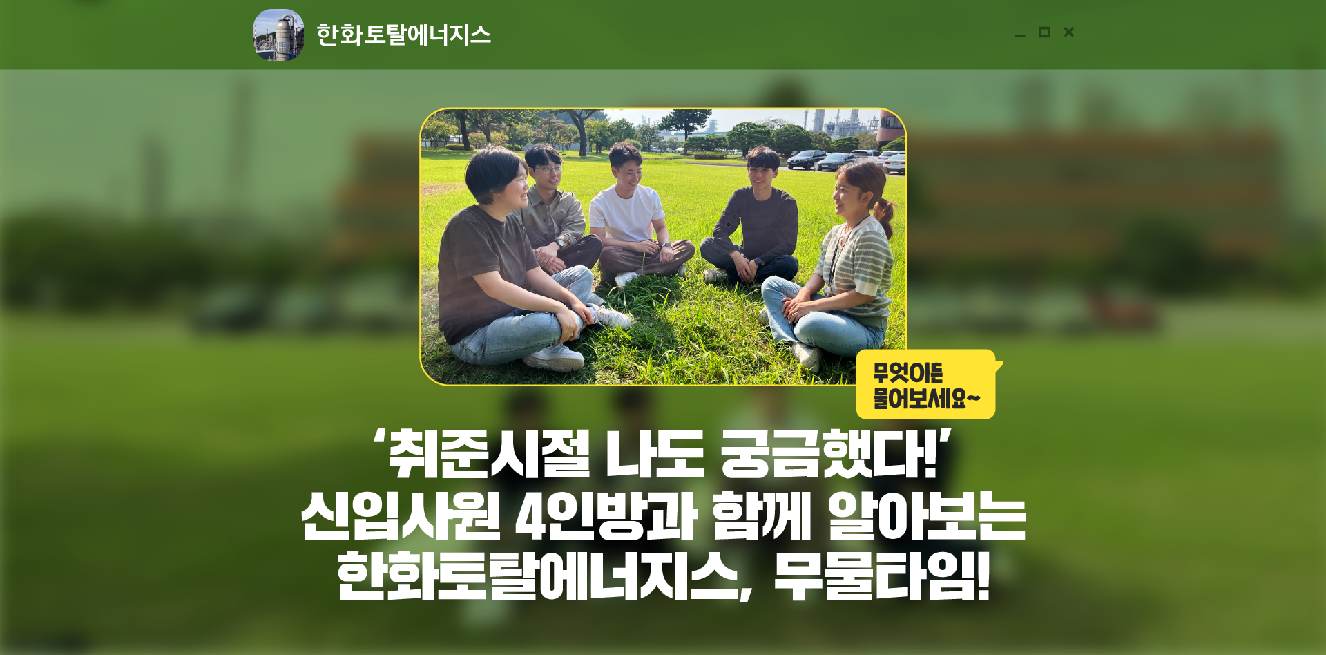 취업 준비 과정은 궁금함의 연속입니다. 취업을 원하는 회사가 어떤 분위기인지, 내 직무에서는 어떤 업무를 맡게 될지, 워라밸은 어떨지 궁금한 점이 참 많은데요. 회사에 어울리는 인재가 되기 위해 공부하면서도 수많은 회사들 중 나와 어울리는 단 하나의 회사를 찾아야 하는 취준생들에게 도움을 주기 위해, 한화토탈에너지스의 신입 4인방이 뭉쳤습니다! 취준 시절, 나도 궁금했던 한화토탈에너지스 이야기! 무엇이든 물어보세요~