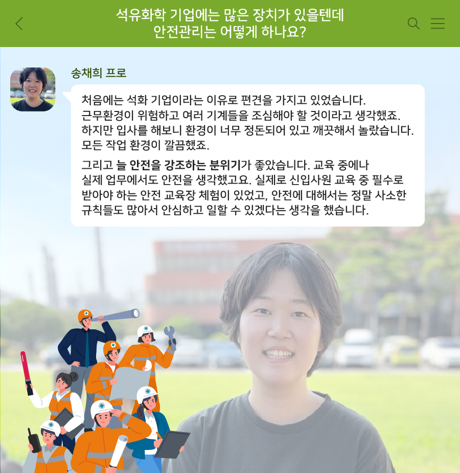 송채희 프로 : 처음에는 석화기업이라는 이유로 편견을 가지고 있었습니다. 아무래도 근무환경이 위험하고 여러 기계들을 조심해야 할 것이라고 생각했죠. 하지만 입사를 해보니 일단, 환경이 너무 정돈되어 있고 깨끗해서 놀랐습니다. 모든 작업 환경이 정돈되어 있었습니다.