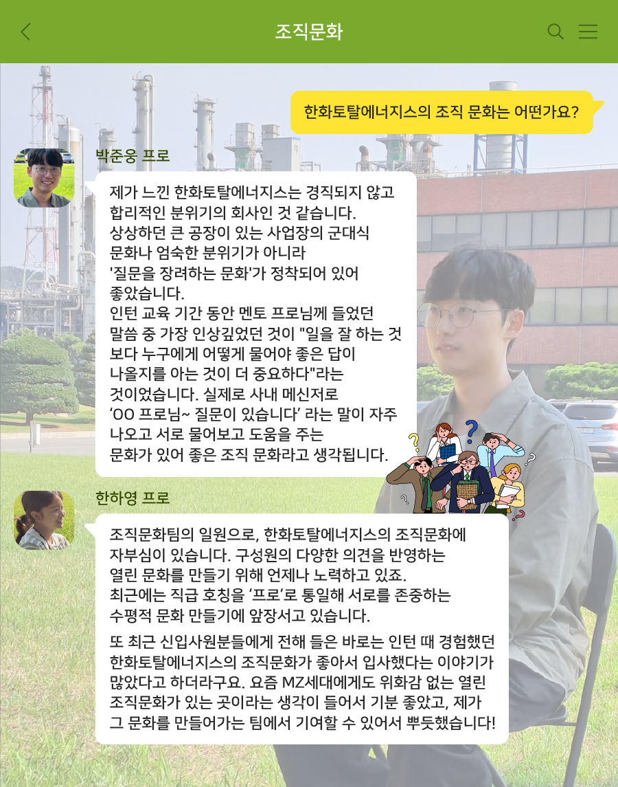 박준웅 프로 : 제가 느낀 한화토탈에너지스는 경직되지 않고 합리적인 분위기의 회사인 것 같습니다. 상상하던 큰 공장이 있는 사업장의 군대식 문화나 엄숙한 분위기가 아니라 '질문을 장려하는 문화'가 정착되어 있어 좋았습니다. 인턴 교육 기간 동안 멘토 프로님께 들었던 말씀 중 가장 인상깊었던 것이 "일을 잘 하는 것 보다 누구에게 어떻게 물어야 좋은 답이 나올지를 아는 것이 더 중요하다"라는 것이었습니다. 실제로 사내 메신저로 누구 프로님~ 질문이 있습니다, 라는 말이 자주 나오고 서로 물어보고 도움을 주는 문화가 있어 좋은 조직 문화라고 생각됩니다.