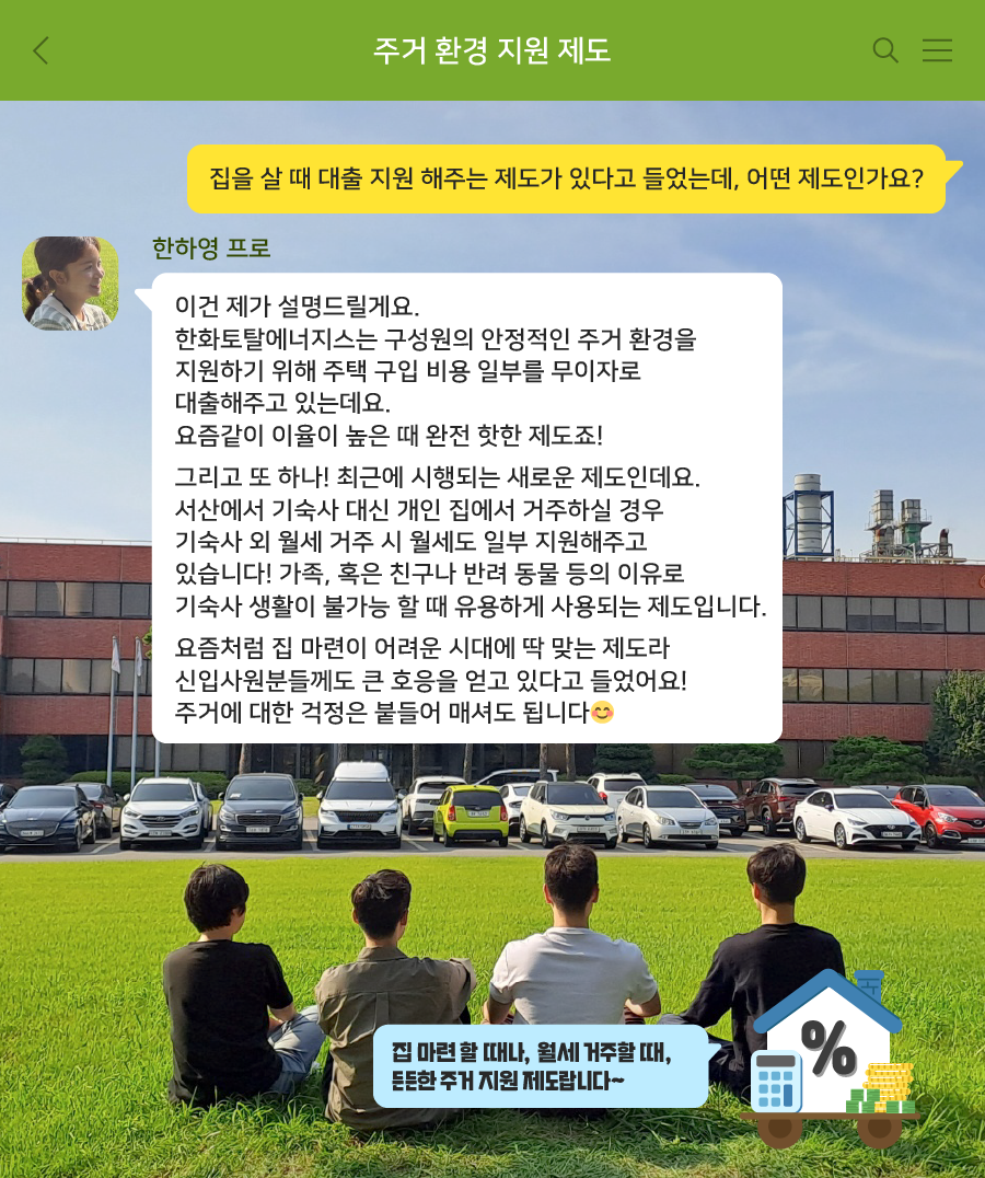 한하영 프로 : 이건 제가 설명드릴게요. 한화토탈에너지스는 구성원의 안정적인 주거 환경을 지원하기 위해 주택 구입 비용 일부를 무이자로 대출 해주고 있는데요. 요즘같이 이율이 높은 때 완전 핫한 제도죠!