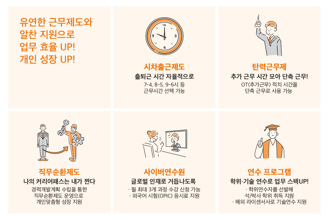 경력개발계획 수립을 통한 직무순환제도 운영으로 개인맞춤형 성장을 지원합니다.