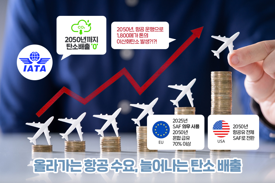 코로나19가 끝난 뒤, 항공 수요는 급격하게 올라가기 시작했습니다. 항공산업은 2050년까지 거의 2배로 성장할 예정이죠. 항공산업분야 전문 연구기관인 ATAG(Air Transport Action Group)가 발간한 한 보고서에 따르면, SAF의 도입이 없이 기존 항공유가 계속 사용된다면 2050년까지 항공 운행으로 1,800메가 톤의 이산화탄소가 발생할 것이라고 합니다.