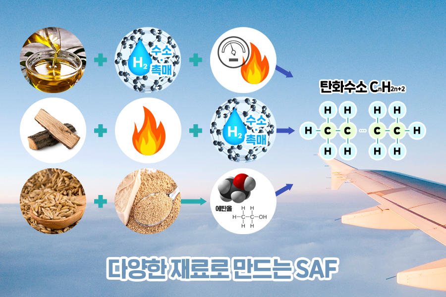 반면, 곡물 등 부산물은 식물에 포함된 당분을 효모로 이용해 발효하는 과정을 거치는데요. 발효를 통해 생성된 에탄올을 원료로 탄화수소를 합성해 항공 연료로 사용합니다.